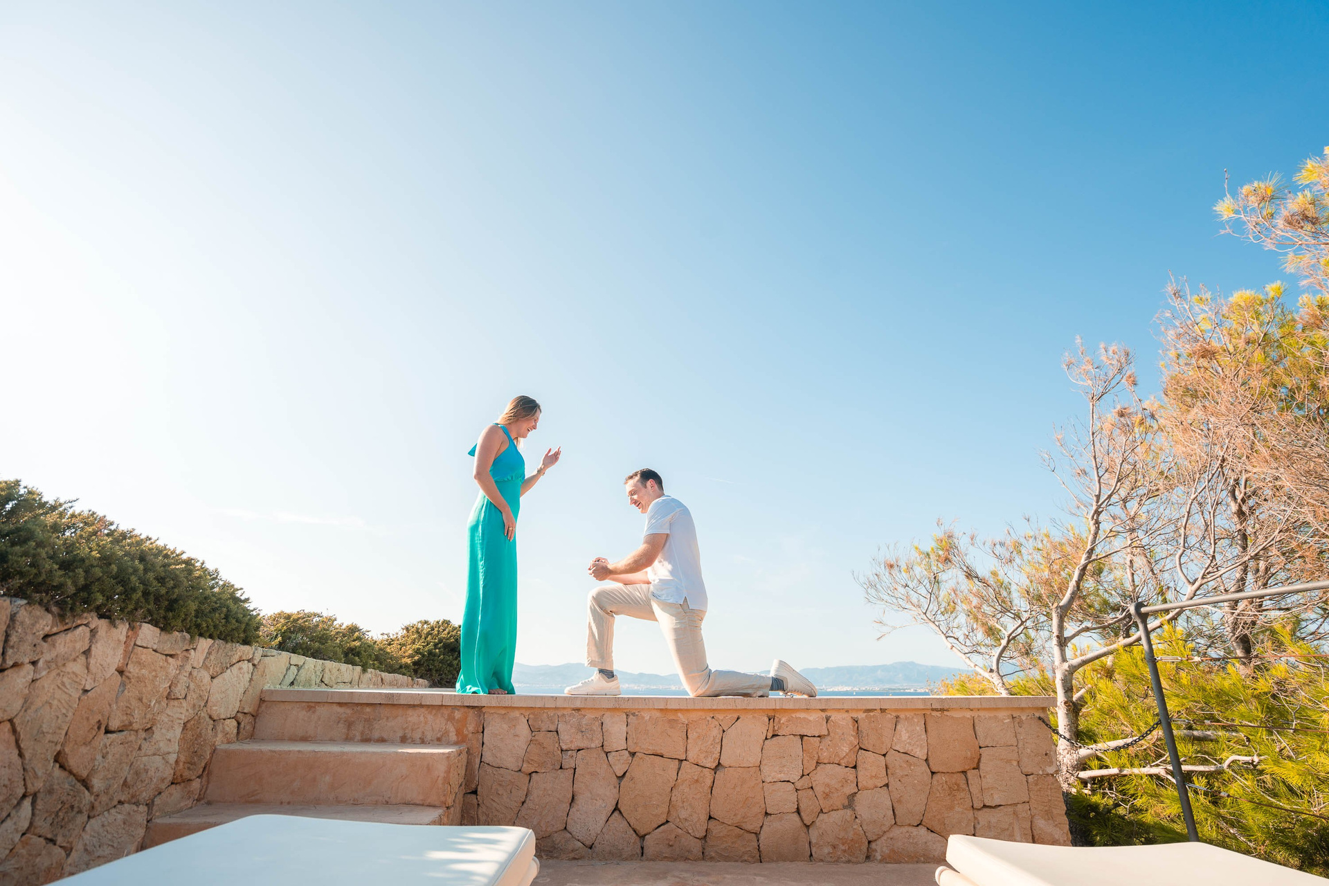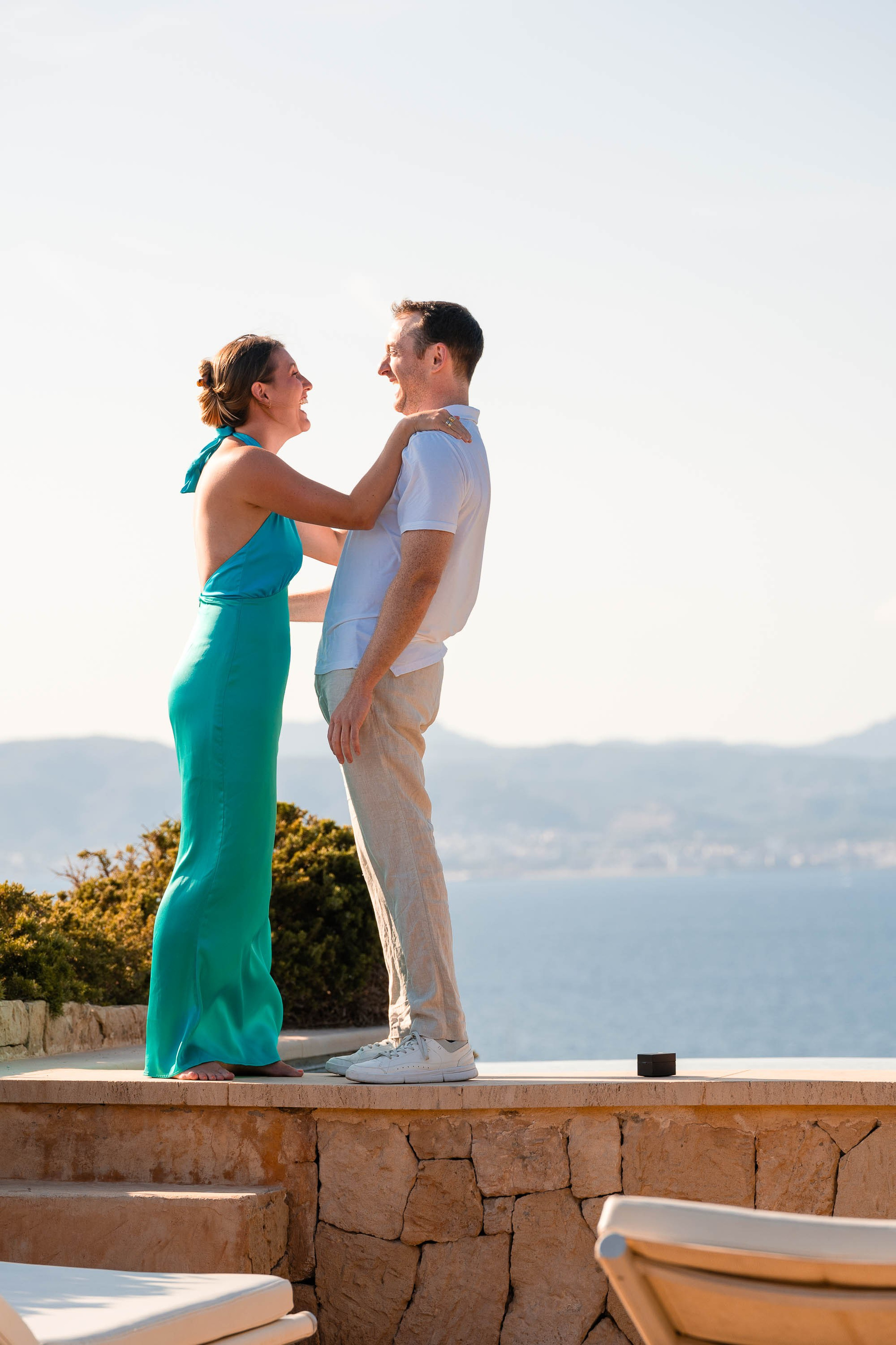 With the Mediterranean as a backdrop and dusk colours in the sky, he drops to one knee and asks the life-changing question.